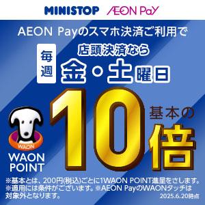 ミニストップ対象店舗にて、毎週、金曜日と土曜日にAEON Payのスマホ決済ご利用で、WAON POINTを基本の10倍進呈。 ※AEON PayのWAONタッチご利用分は対象外です。※適用には条件がございます。