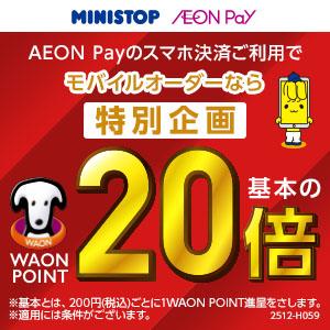 期間中毎日、ミニストップモバイルオーダー(WEB版・アプリ版)でAEON Payのスマホ決済をご利用するとWAON POINTを基本の20倍進呈いたします。