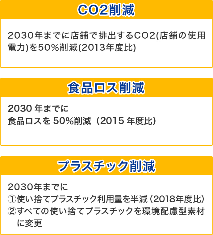 このミッションのもと、加盟店をはじめとした多くのステークホルダーとともに環境に配慮した取り組みを推進し、持続可能な社会の実現に向けて積極的に行動してまいります。