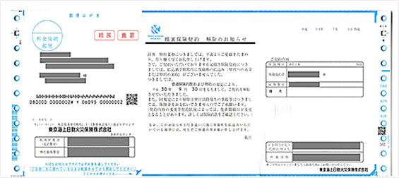 払込期日の翌月末までに保険料のお払込み手続きが完了しなかった場合、「損害保険契約 解除のお知らせ」というハガキをお送りしています。