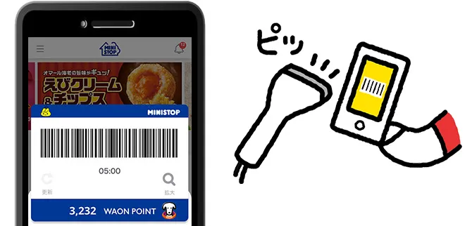 - スマートレシート連携したミニストップアプリ会員バーコードを、お会計の際にレジにてご提示ください。