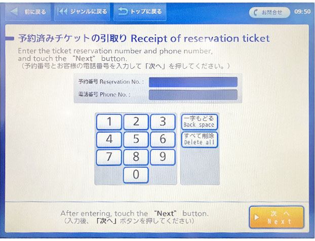 予約番号とお客様の電話番号を入力して画面を進めます。