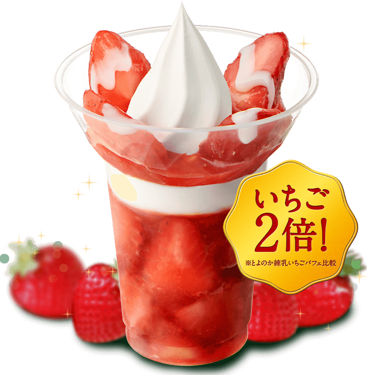 いちごが2倍!たっぷりいちごパフェ「とよのかいちごパフェ」の1.5倍のお値段でいちご量2倍!ソースも倍量使用し、よりみずみずしいおいしさに仕上げました。いちごが2倍!たっぷりいちごパフェ「とよのかいちごパフェ」の1.5倍のお値段でいちご量2倍!ソースも倍量使用し、よりみずみずしいおいしさに仕上げました。