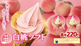 初夏に人気のフルーツ、白桃を使用したソフトクリームが登場!芳醇な香りとすっきりとした甘さで、桃をまるごと食べているような味わいです。