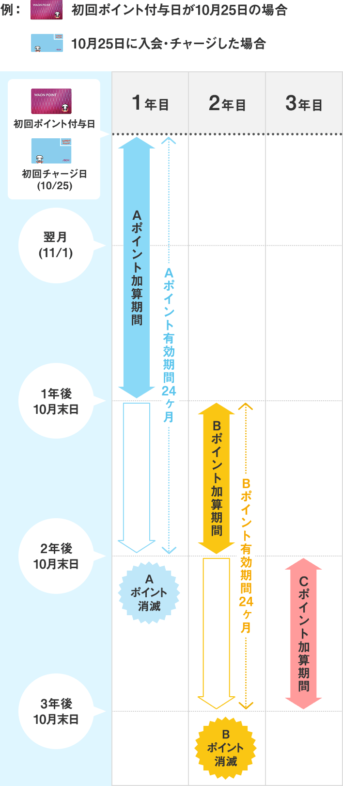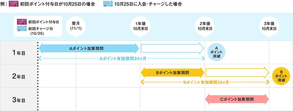 ただし初年度の加算期間は、初回チャージまたは初回ポイント付与日から、1年経過後の月末までとして、その後は1年ごととなります。